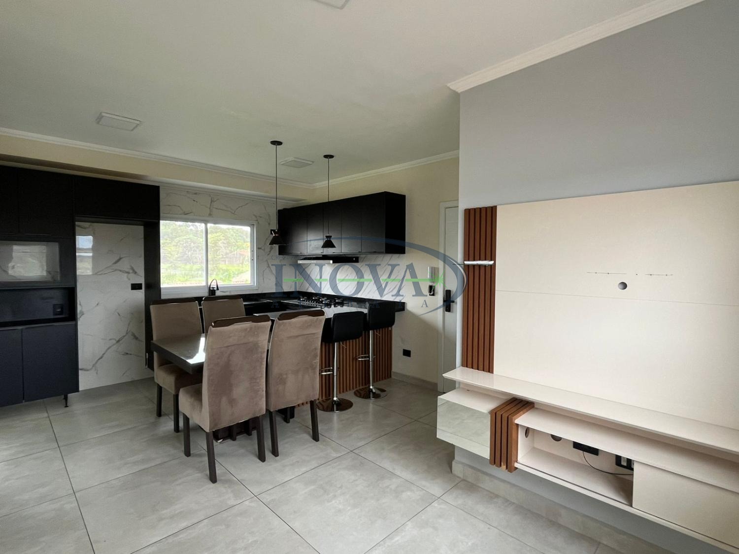 A cozinha americana traz praticidade ao dia a dia, integrando-se à sala e facilitando a circulação no ambiente. O espaço conta com móveis planejados que otimizam a organização.