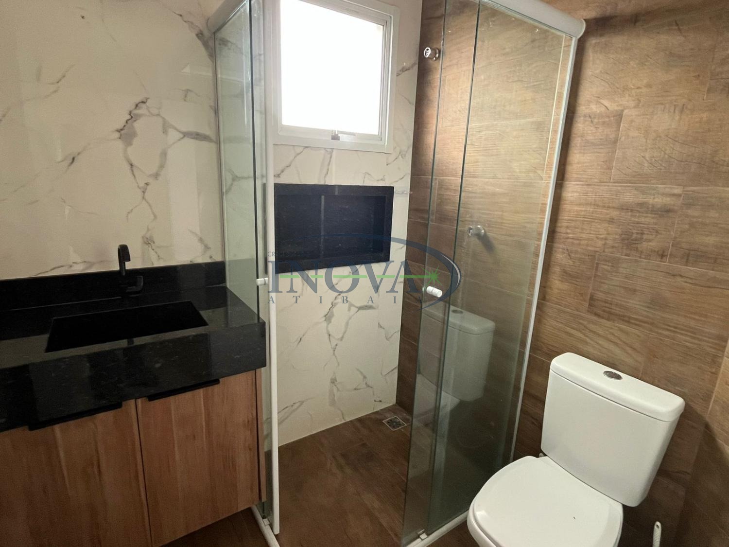 O banheiro já conta com box instalado, oferecendo mais praticidade, conforto e funcionalidade para o uso diário.