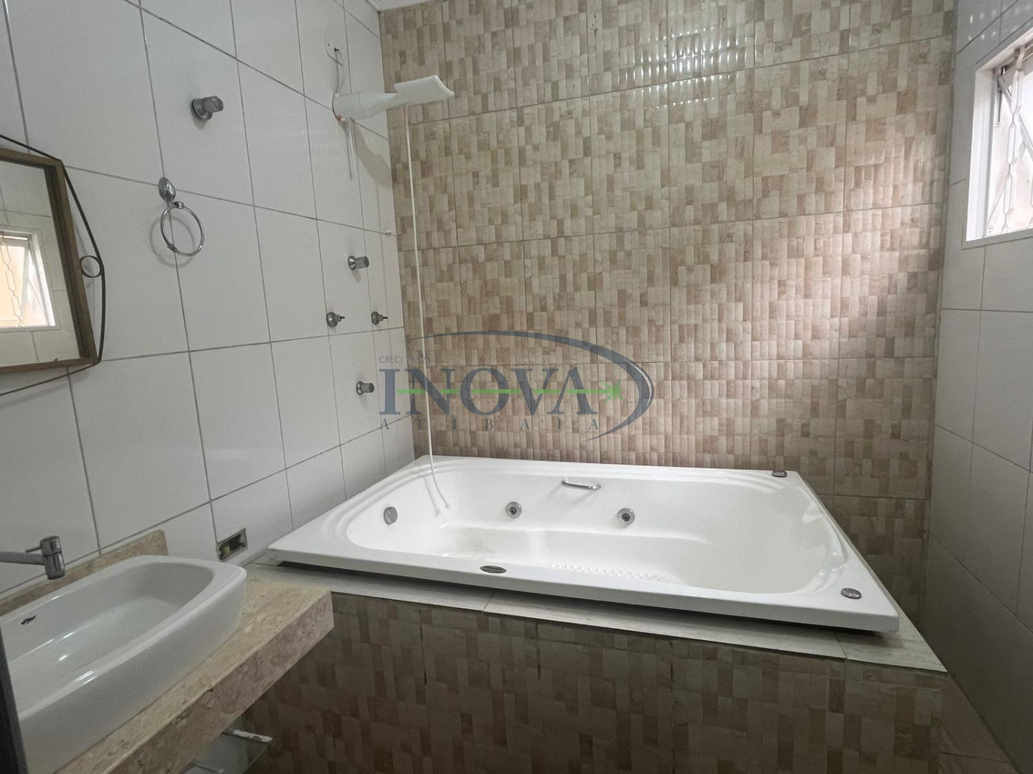 A suíte possui banheiro com banheira, proporcionando momentos de relaxamento e bem-estar.